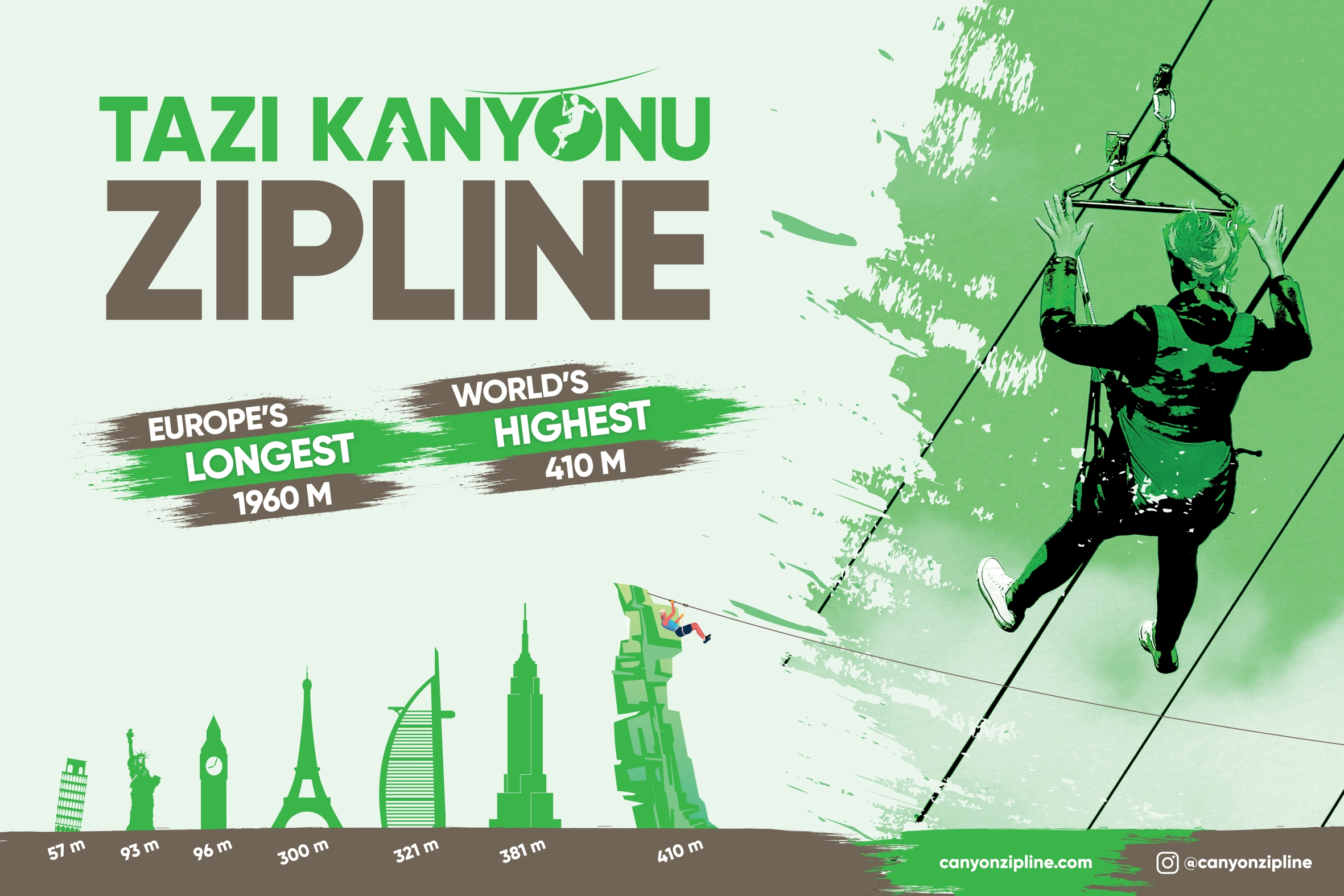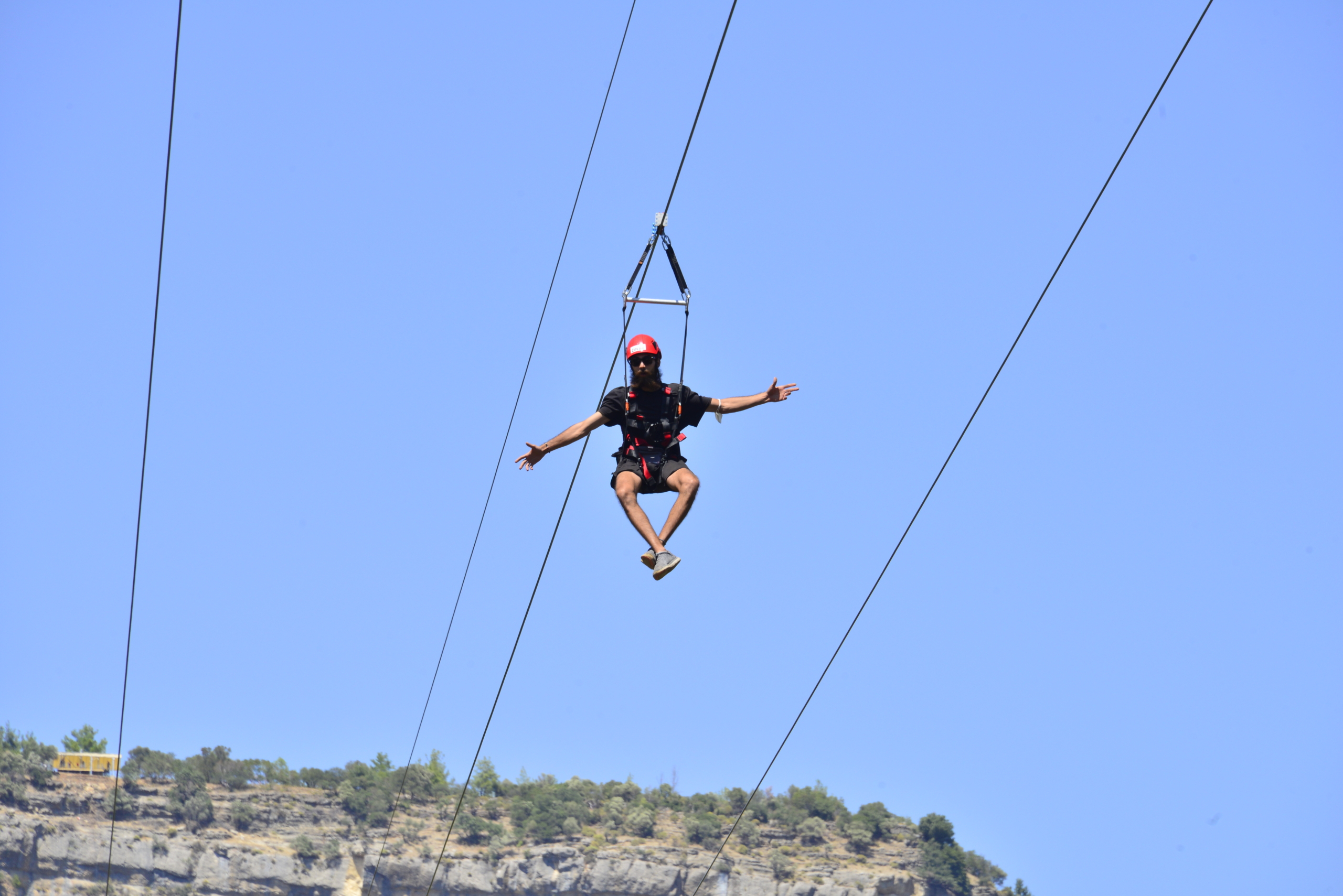 Her biri 1960 metre uzunluğunda olan ve yan yana 3 hatta sahip Tazı Kanyonu Zipline’da ayakların yerden kesildiği anda tam 410 metre yüksekte olacaksın!